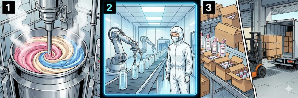 | 1. 原料・資材の調達 | 化粧品の中身になる「原料」や、ボトルや箱などの「資材」を手配します。 |