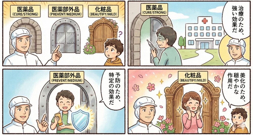 - 医薬部外品 = 医薬品と化粧品の「中間」。予防や衛生を目的に、一定の効果が期待できる。