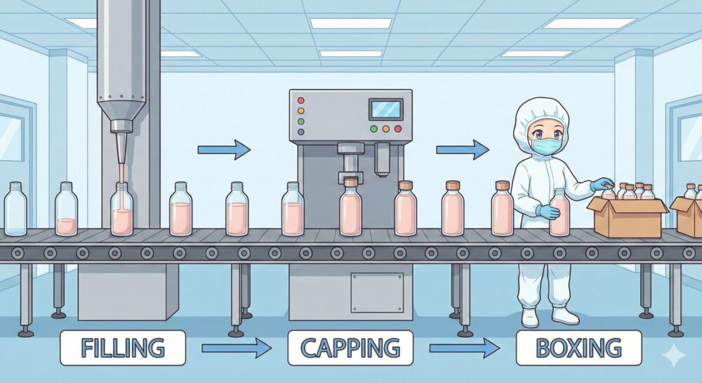 最初に、化粧品のライン作業の基本的な流れを簡単に説明します。