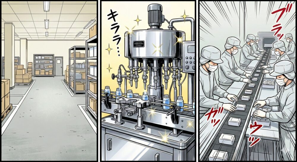 一体感はありますが、そのぶん業務の幅は広くなります。「充填包装の担当だけど、製品出荷も手伝う」「中身を作る(バルク製造)担当だけど、包装も手伝う」といった、一人二役が求められる可能性が高いです。 - 規模が大きい工場: