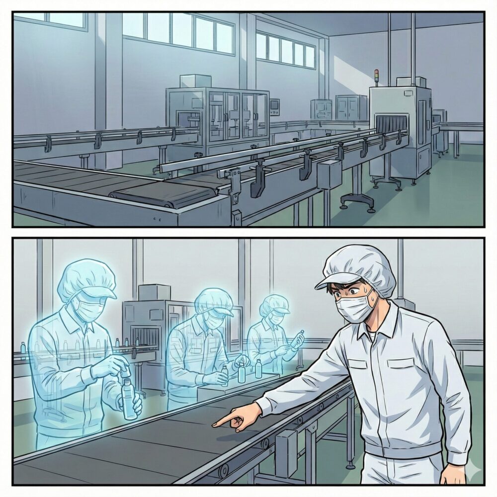 数字を見るだけではありません。新人くんは、まだパートスタッフのいない静かな作業ラインに向かって指をさしながら、人の配置や機械の動きをシミュレーションします。