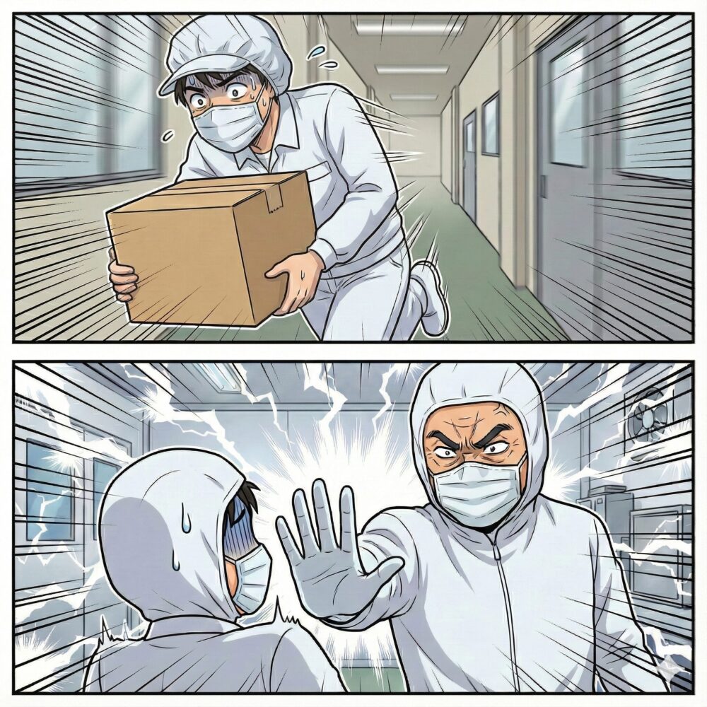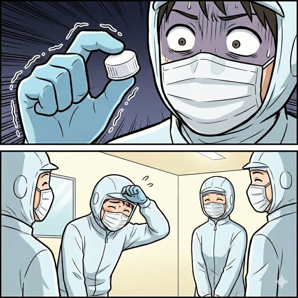新人くんは先輩の指示に従い、特定の衣服(無塵着)、帽子、手袋、マスク、靴を着用します。慣れないうちは、この着替えだけで一苦労。 粘着ローラーでホコリを取り、エアーシャワーの強風を浴びて、ようやく入室です。