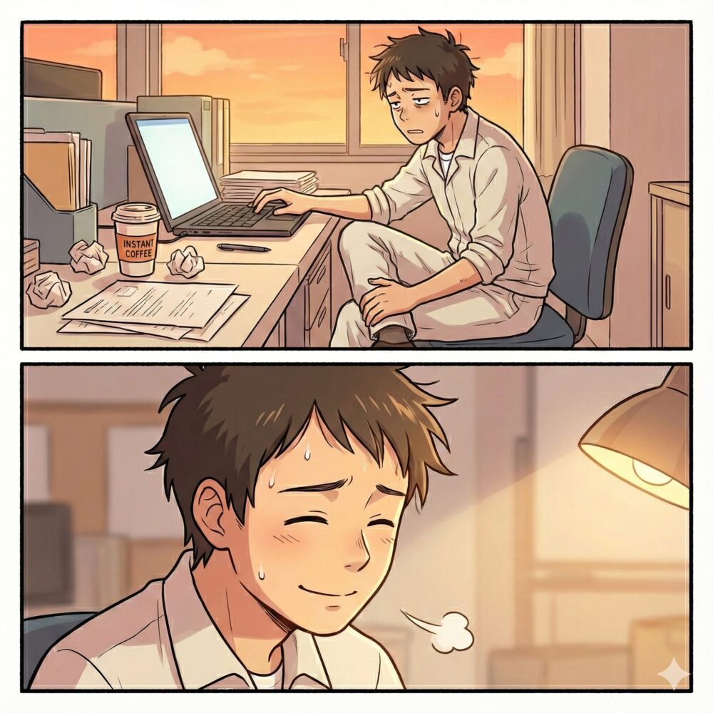 ようやく事務所に戻り、椅子に座ります。1日立ちっぱなしだった足には疲労がありますが、座った瞬間の安堵感は格別です。
